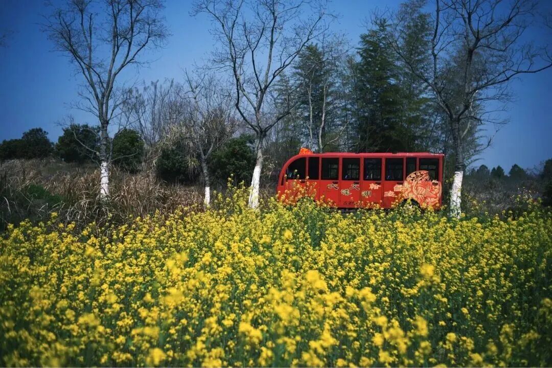 红色观光车载满春风缓缓驶过,